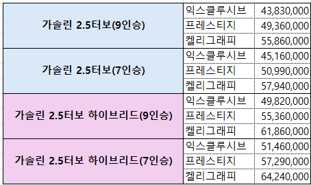 9인승 출시 여부는 출시시기가 확정되고, 예상도가 나오고, 실물이 조금씩 포착되어가면서 가장 화제가 되었던 문제입니다. 마지막 정보에 의하면 2.5가솔린 모델에만 9인승이 적용가능 할 수도 있다고 했습니다. 하지만 사전계약 실시가 된 후 정보를 찾아보니 2.5터보 모델이나 2.5 터보 하이브리드 모델이나 7인승과 9인승 선택이 가능하다고 합니다.